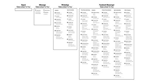 سیگنال و واتساپ از فناوری یکسان برای رمزگذاری سرتاسری استفاده میکنند، بنابراین در هردوی آنها محتوای پیامها و تماسها شخصی باقی میمانند. با این حال فیسبوک دادههای بسیار بیشتری را به شکل آمار میزان استفاده، متادیتا و موارد دیگری را جمعآوری میکند و دیگر نمیتوان از چنین کاری جلوگیری کرد.