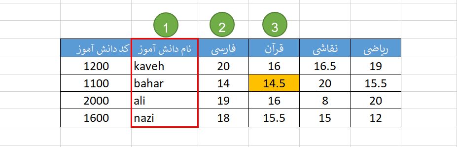 چون سومین ستون جدول (یعنی نمره قرآن) را باید پیدا میکردیم، حتما باید جدول ما حداقل تا ستون E باشد. بنابراین ادامه تابع ما میشود