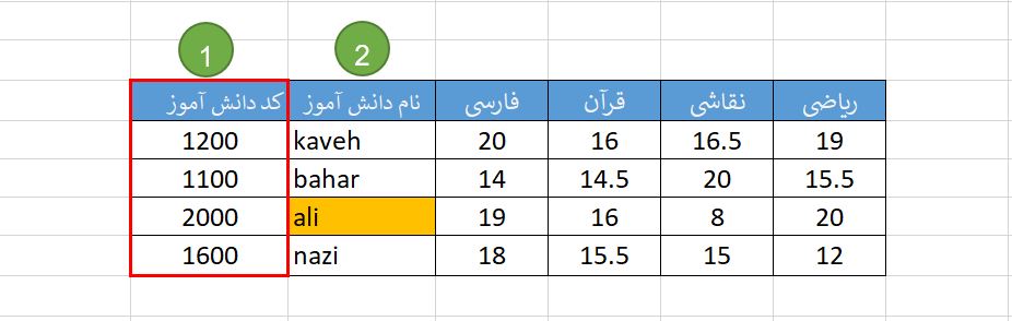 برای ما در این سوال کد دانش آموز مشخص شده، بنابراین ستون معلوم های ما، ستون «کد دانش آموز» است و بنابراین اولین ستون جدول در اینجا «کد دانش آموز» خواهد بود و دومین ستون جدول «نام دانش آموز» و سومین ستون جدول «فارسی» می باشد. پس پاسخ این سوال عدد «علی» خواهد بود.