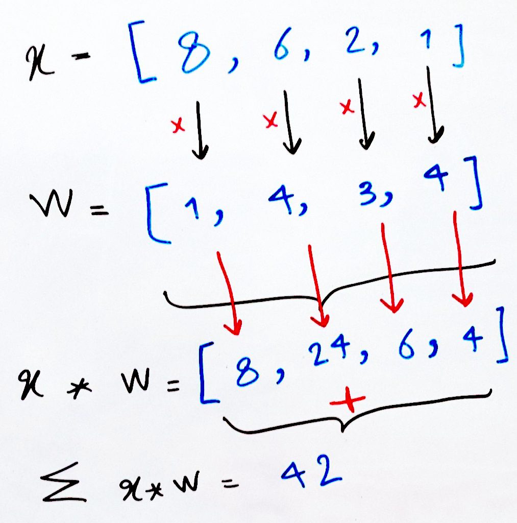 همانطور که میبینید، این تصویر مثالی از شکل کلیِ تصویرِ اول بود. ورودیها که همان Xها هستند در وزنها (W) ضرب شده و نتیجهی آنها با یکدیگر جمع میشود. در اینجا فرض میکنیم که تابعِ فعالسازی همان عددِ مجموع را بدون تغییر به ما برمیگرداند. پس در واقع در مثالِ تصویر بالا، خروجیِ شبکهی عصبی برابر ۴۲ است. در دروس آینده خواهیم دید که تابعِ فعالسازی، معمولاً نتیجهی خروجی را تغییر میدهد.