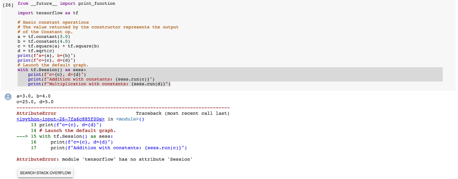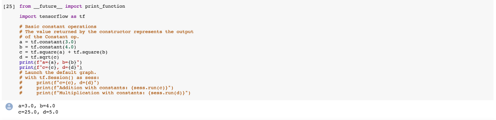 خروجی دقیقا چیزی است که کاربر نیاز دارد، بدون هرگونه خطایی. در حقیقت اگر کاربر تلاش کند که یک سشن را اجرا کند، با خطا مواجه میشود، چون دیگر سشنی وجود ندارد. بنابراین، مفهوم «اول ساخت گراف و سپس اجرای بخشی از گراف» با استفاده از ()tf.Session.run، در تنسورفلوی ۲.۰ منسوخ شده است.