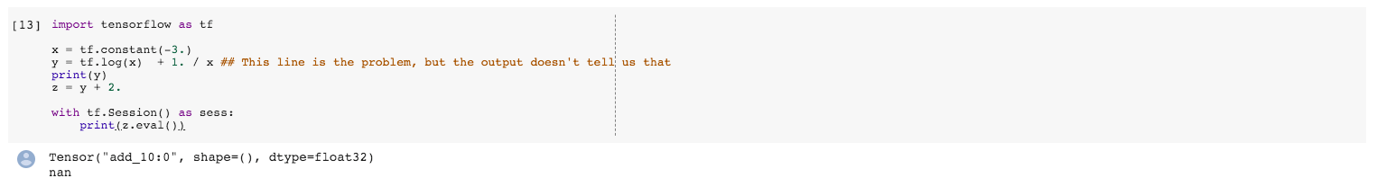 بدون شک، «اشکالزدایی» (Debugging) در تنسورفلو تاکنون خیلی سخت بوده است. ساعتهای زمان زیادی زمان میبرد تا شرایطی مانند آنچه در تصویر زیر آمده، اشکالزدایی شود.