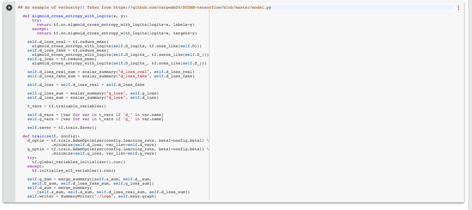 Verbose مفهومی عمومی در برنامهنویسی است که به تولید حجم زیادی از لوگهای خروجی اشاره دارد. در واقع، می توان از برنامه درخواست کرد که «همه چیز را درباره کاری که در کل مدت زمان انجام میدهد بگوید». TF 1.0 دارای مفاهیم زیادی مانند متغیرها، پلیسهولدرها، servables، «تنسوربورد» (tensorboard)، سشن، گراف محاسباتی، مقادیر هایپرپارامترها (Hyperparameter) و قواعد قالببندی است که کاربر باید باید کلیه آنها را حتی پیش از آغاز صحبت پیرامون نظریه «یادگیری عمیق» (Deep Learning) بیاموزد (منحنی یادگیری بالا). در ادامه، میتوان مثالی از verbosity را مشاهده کرد (مثالی از یک «شبکه مولد تخاصمی پیچشی عمیق» (Deep Convolutional Generative Adversarial Network)).