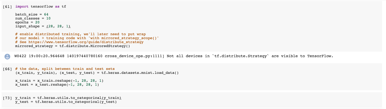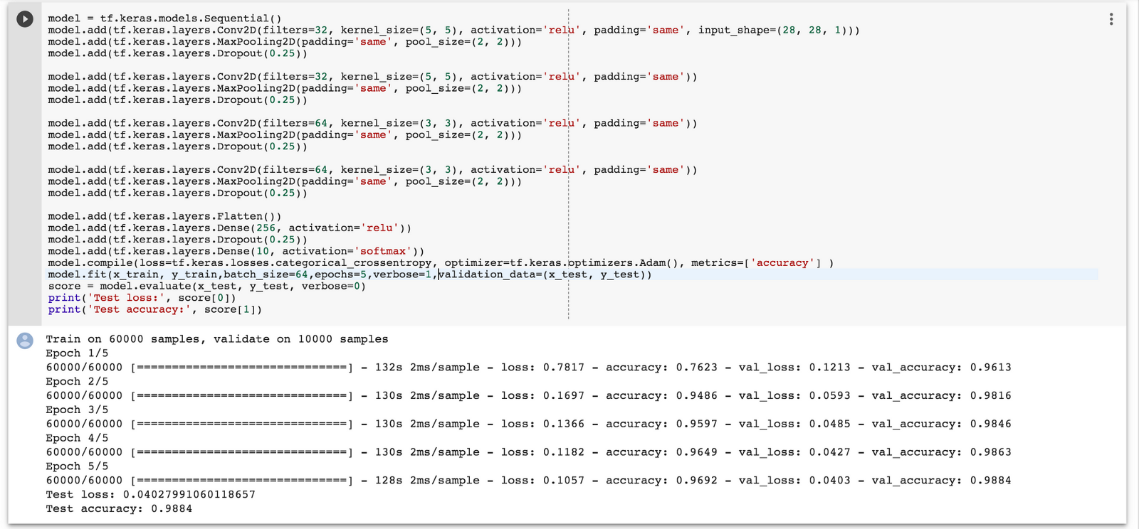 کد بالا، مثالی از آموزش یک مدل در Collab به حساب میآید که فوقالعاده عالی و کوتاه است و تنها چیزی است که باید در تنسورفلو «وارد» (Import) کرد. «کراس» (Keras) به طور جداگانه ایمپورت نشده است، زیرا اکنون به صورت توکار در TF 2.0 وجود دارد. بنابراین، با استفاده از TF 2.0 میتوان یک شبکه عصبی را تنها با چند خط کد با بهرهگیری از API متوالی کراس ساخت.