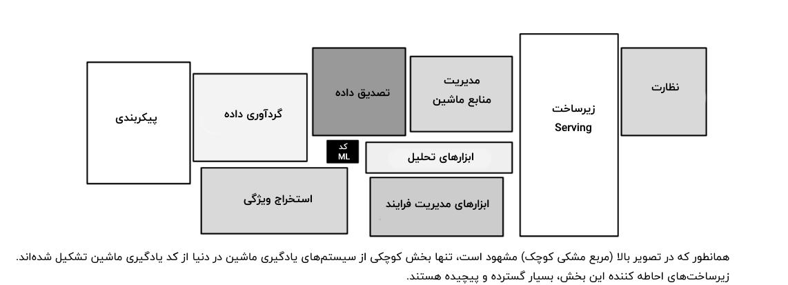 اگر به روال انجام پروژههای علم داده نگاه شود، می توان به سادگی فهمید که کد یادگیری ماشین بخش کوچکی از کل روال علم داده است. مولفههای دیگری همچون موارد زیر نیز وجود دارند؛