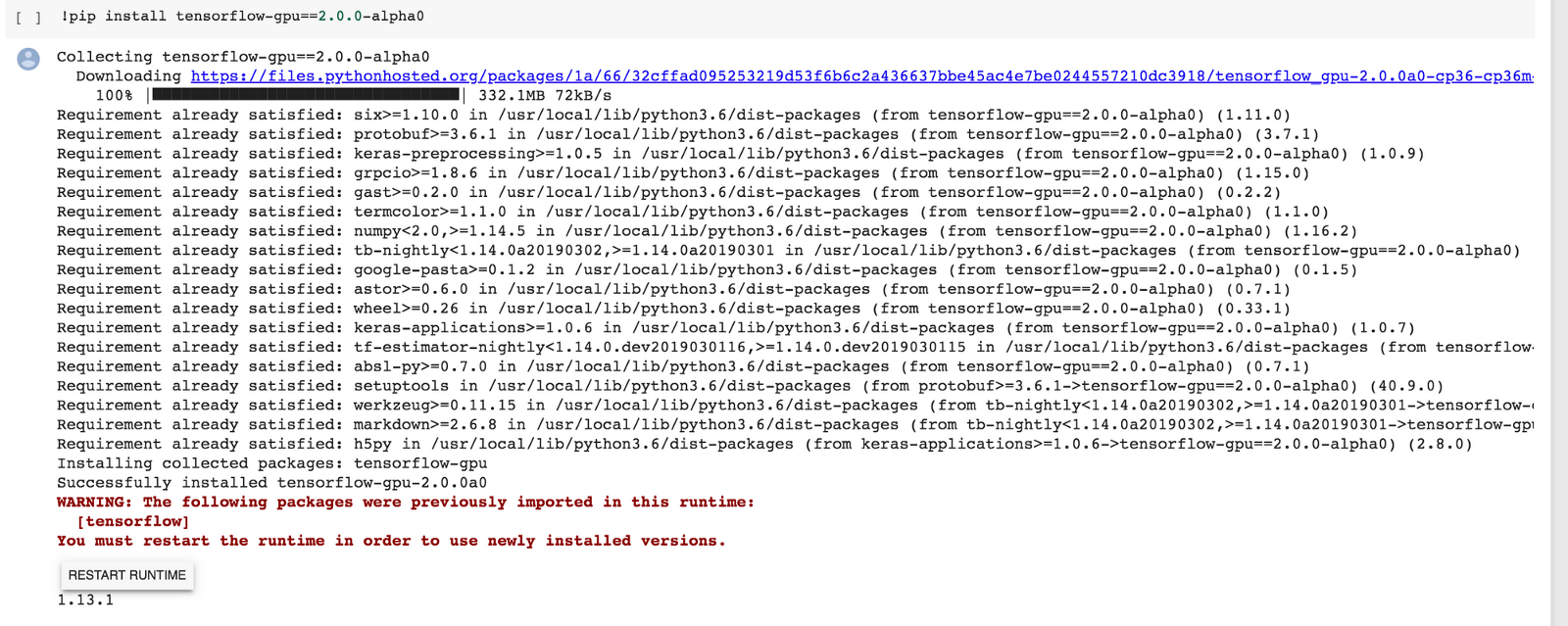 هنگام نصب TF 2.0 روی Colab، این امکان وجود دارد که از کاربر خواسته شود زمان اجرا (runtime) را بازنشانی کند. بنابراین، باید مراحل را ادامه و بازنشانی را حتما انجام دهد.