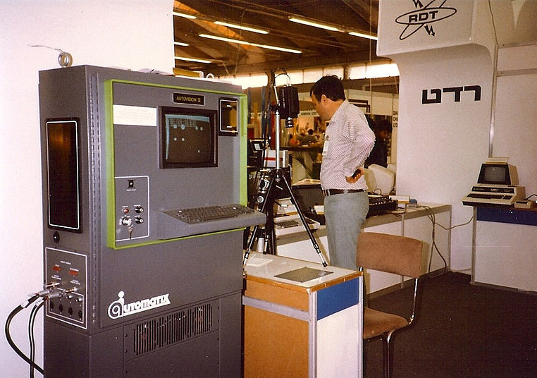 سیستم بینایی ماشین اولیه اتوویژن 2 ساخته شده 1983 اتوماتیکس «که اکنون بخشی از اُمرُن است» در یک نمایشگاه تجاری. دوربین روی سه پایه به یک میز نوری اشاره میکند تا تصویری با پس زمینه روشن روی صفحه تولید شود، که سپس تحت فرایند استخراج حباب قرار میگیرد.