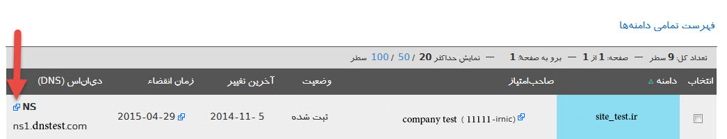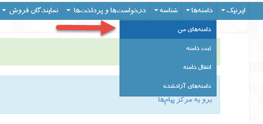 ۱- ابتدا وارد سایت نیک به آدرس http://www.nic.ir شده و login نمایید و از منوی “دامنه ها” گزینه “دامنه های من” را انتخاب نمایید: ۲- در صفحه باز شده در قسمت “فهرست تمامی دامنه ها” رو به روی دامنه مورد نظر روی فلش کنار ” NS ” کلیک نمایید: