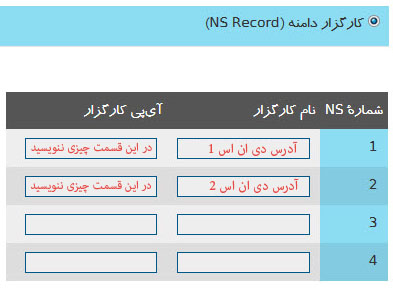 ۳- در قسمت ” کارگزار دامنه ” آدرس های دی ان اس را وارد نمایید:
