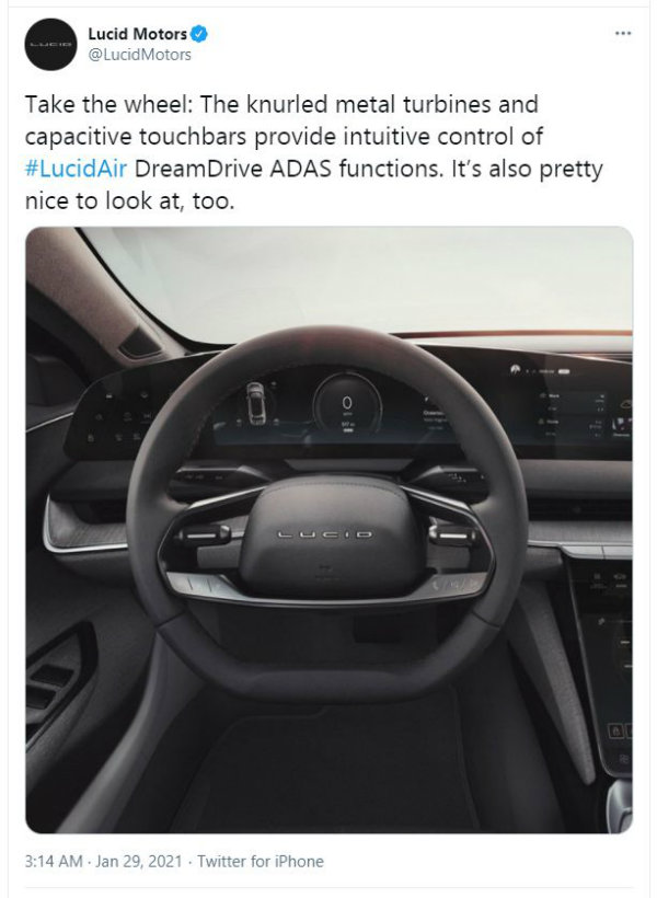 در این پست لوسید موتورز تصویری از فرمان سدان برقی Air را منتشر کرده و در زیر آن نوشته: