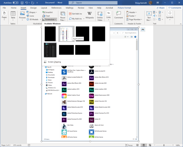 در نوار بالای صفحه روی گزینه Insert کلیک کرده و گزینه اسکرین شات را انتخاب کنید. یک پنجره در برابرتان قرار میگیرد که تمام پنجرههای باز روی کامپیوتر را به نمایش میگذارد. با کلیک روی هرکدام از آنها، یک اسکرین شات به متن شما اضافه میشود. این ویژگی باعث صرفهجویی زیادی در زمان شما خواهد شد.