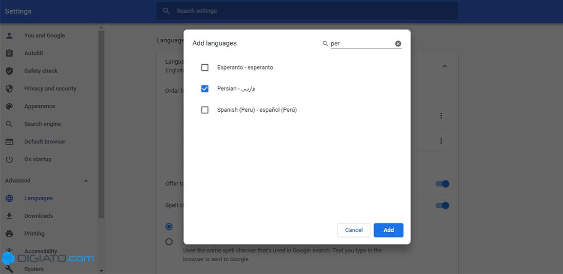 روی منوی کشویی Language کلیک کرده و گزینه Add languages را انتخاب کنید. در پنجرهای که باز میشود، با تایپ کلمه Persian یا فارسی، زبان فارسی را پیدا کرده، آن را انتخاب و در پایان روی گزینه Add کلیک کنید.