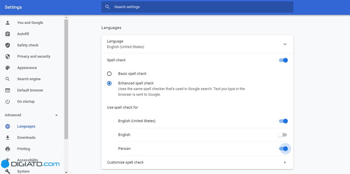 در صفحه تنظیمات در نوار سمت چپ، روی گزینه Advanced کلیک کنید. در منویی که باز میشود، گزینه Language را انتخاب کنید. در این بخش باید گزینه Spell Check را فعال کنید. بد نیست بدانید با جستجوی کلمه Spell هم میتوانید در تنظیمات به چنین بخشی دسترسی پیدا کنید. در بالای این بخش، گزینه زبان به چشم میخورد که در کنار زبان انگلیسی، باید فارسی را هم به آن اضافه کنید.