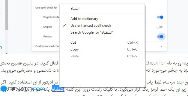 تنها با همین چند مرحله، غلط یاب املایی فارسی در کروم فعال میشود و میتوانید در ادیتور از آن استفاده کنید. اگر یک کلمه را اشتباه تایپ کنید، زیر آن یک خط قرمز رنگ قرار میگیرد. با کلیک راست روی این کلمه اشتباه، یک منو باز میشود که در بالای آن املای صحیح کلمه به چشم میخورد که با کلیک روی آن، جایگزین کلمه اشتباه میشود.