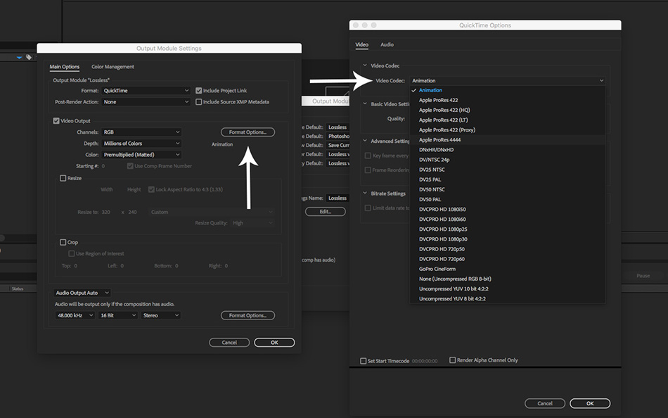 هر فرمت تنظیمات خاص خود را دارد که میتواند تغییر یابد. برای نمونه با انتخاب کردن فرمت Quicktime میتوانید کدکی که ترجیح میدهید را نیز انتخاب کنید؛ این کار از طریق زدن دکمه Format Options انجام مییابد و در ادامه گزینهها و کدکهای مرتبط با فرمت Quicktime به صورت یک لیست در اختیار شما قرار میگیرند.