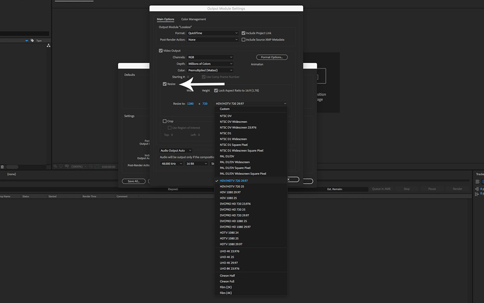 تنظیمات ماژول خروجی نیز امکان تغییر دادن اندازه کامپوزیشن را هنگام رندر کردن فراهم میسازد و از این رو به جای ایجاد دو کامپوزیشن مجزا و رندر کردن آنها به صورت تکتک، میتوانید اندازه کامپوزیشن موجود را تغییر داده و آنها را همزمان رندر کنید. تیک گزینه Resize را بزنید و سپس یا اندازه مورد نیاز را وارد کرده و یا یکی از موارد preset را انتخاب کنید. فراموش نکنید که Resize Quality را نیز روی High قرار دهید. بدین ترتیب بهترین خروجی را به دست میآورید: