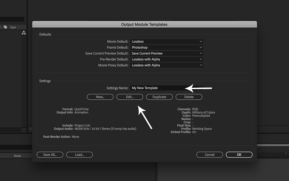 به مسیر Edit > Templates > Output Module بروید، یک نام جدید برای Settings Name وارد کنید و سپس روی Edit کلیک کنید.