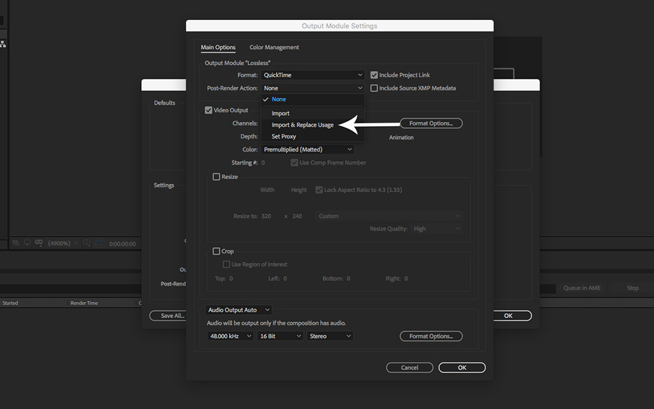 میتوانید فرمت ترجیحی خود را انتخاب کنید و همچنین «عمل پس از رندر» (Post-Render Action) را که میخواهید افترافکت پس از پایان یافتن رندر انجام دهد انتخاب کنید.