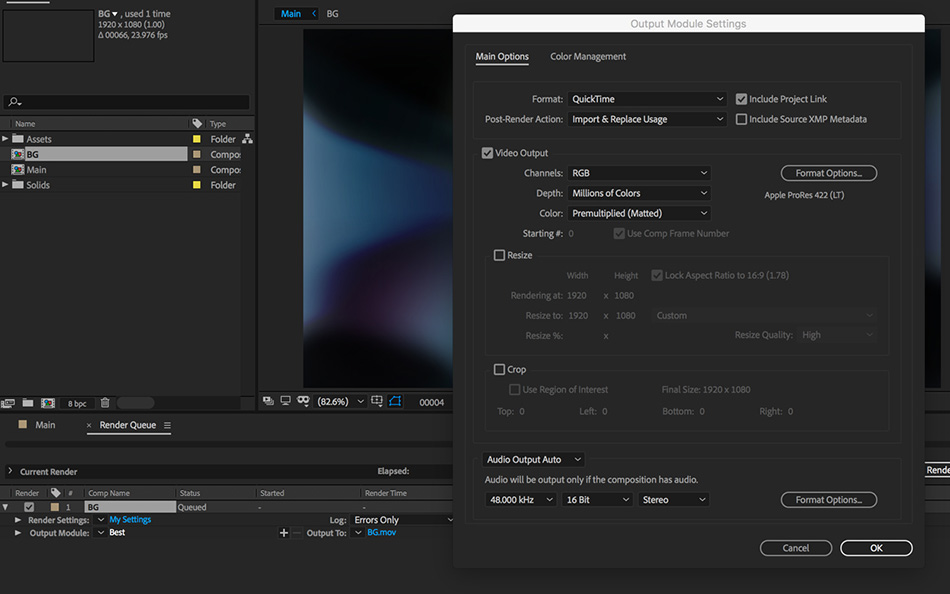 کامپوزیشن پسزمینه نسبتاً سنگین است و از این رو تصمیم داریم آن را رندر کنیم و سپس از گزینه Import and Replace استفاده کنیم.