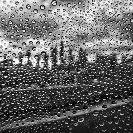 عکس بالایی از شیشهی جلویی خودرو ثبت شده است. وجود قطرههای آب بر روی پنجره باعث شده است که درختهای موجود در پس زمینهی عکس به شکل خلاقانهای درهم ریخته به نظر برسند. عکاس این عکس در زمان ثبت این عکس سعی کرده است که تا بعد از ورود یک شخص دارای چتر به کادر این تصویر را ثبت کند.
