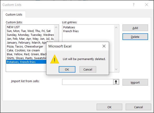 برای حذف یک لیست سفارشی، آن را در باکس Custom Lists انتخاب کرده و سپس روی گزینه Delete کلیک کنید. در نهایت برای تایید حذف این لیست، باید در پنجره جدید روی گزینه OK کلیک کنید.