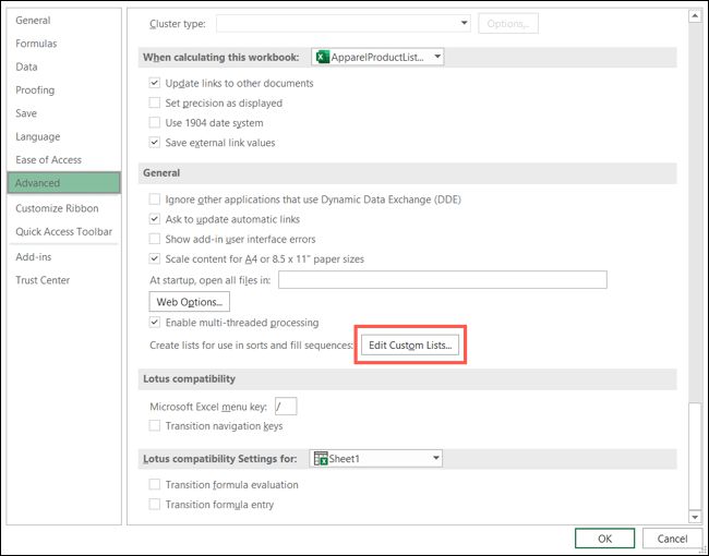 دادههای موردنظرتان را انتخاب کرده و سپس وارد ورکبوک و تنظیمات شوید. در ویندوز به مسیر File > Options بروید و از نوار سمت چپ، گزینه Advanced را انتخاب کنید. در منوی سمت راست اسکرول کنید تا به بخش General برسید. در اینجا روی گزینه «Edit Custom Lists» کلیک کنید.