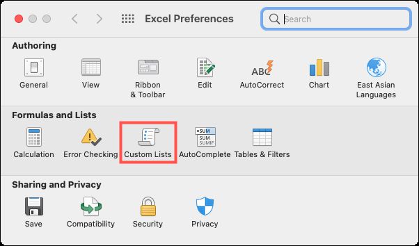 در سیستم عامل مک او اس به مسیر Excel > Preferences بروید. در بخش Formulas and Lists، روی گزینه «Custom Lists» کلیک کنید.