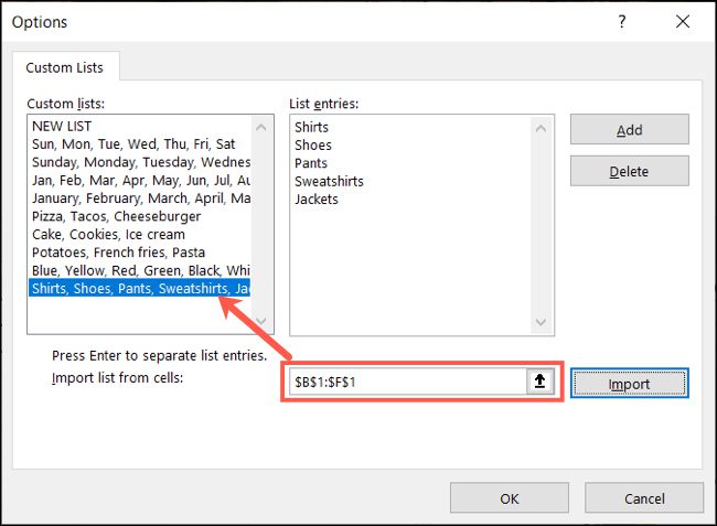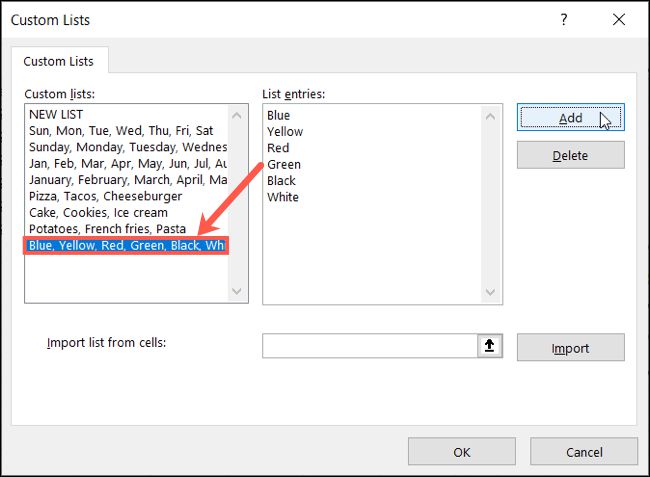 روی گزینه Add کلیک کنید تا لیست دادههای شما در باکس Custom Lists ظاهر شوند. اگر دیگر با این بخش کاری ندارید، روی گزینه OK در ویندوز کلیک کنید یا در مک او اس به راحتی پنجره لیستهای سفارشی را ببندید.