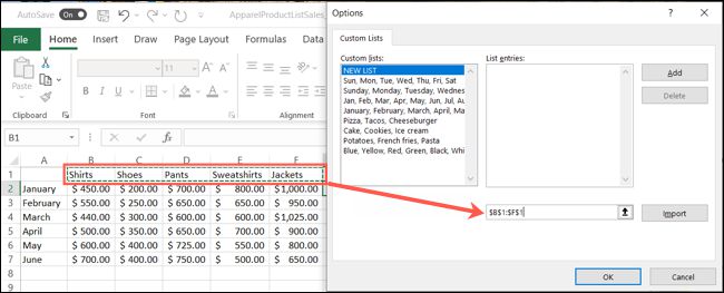 اگر پنجره Custom Lists را بستهاید، با استفاده از روش بالا دوباره به سراغ آن بروید. در نوار مربوط به Import، محدوده سلولهای شامل دادههای موردنظرتان را تایپ کنید. بجای اینکار میتوانید از نشانگر ماوس برای درگ این لیست استفاده کنید و در نهایت روی گزینه Import کلیک کنید.