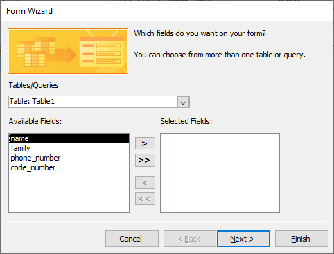 پس از انتخاب جدول مورد نظر فیلدهای این جدول به صورت خودکار در بخش Available Field مشخص میشود. دکمهی > فیلد مورد نظر و دکمهی >> همه فیلدها را در قسمت Selected Field قرار میدهد. با این کار فیلدهایی را که در این لیست وجود دارد در فرم ظاهر خواهد شد. بعد از انتخاب فیلدها، با انتخاب دکمه Next وارد مرحله بعدی خواهیم شد.
