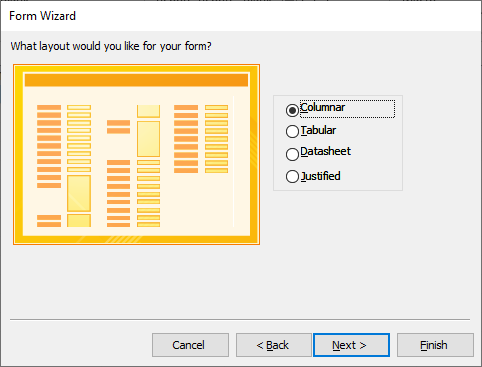 ما در این مثال نوع فرم را Columnar انتخاب میکنیم. با دکمهی Next به مرحله بعدی خواهیم رفت.