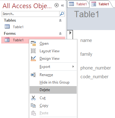 - اجرای دستور Delete از فهرست کلیک راست در برگه Form