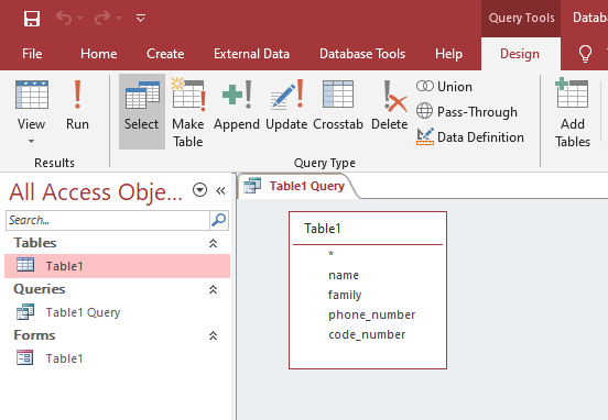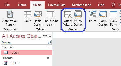 در واقع Select Query به ما این امکان را میدهد که رکوردهای مورد نظر را از جداول بانک اطلاعاتی انتخاب کنیم. برای ایجاد یک Query از برگه Create از بخش Queries اقدام میکنیم. برای ساخت یک Query جدید 2 روش وجود دارد.