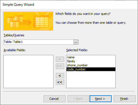 برای سادگی کار در این نوشتار با پرس و جوی ساده (Simple Query Wizard) موضوع را پی میگیریم. با اجرای این دستور پنجرهای به صورت زیر ظاهر میشود. در این پنجره، در لیست Tables/Queries جداول یا پرس و جوی مورد نظر را انتخاب میکنیم. در قسمت Available Fields فیلدهای جدول انتخابی نشان داده میشود. با انتخاب هر فیلد و زدن دکمه > فیلد مورد نظر به قسمت Selected Fields منتقل شده و در پرس و جو به کار میرود.