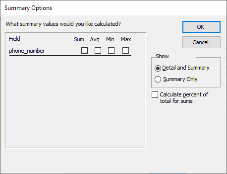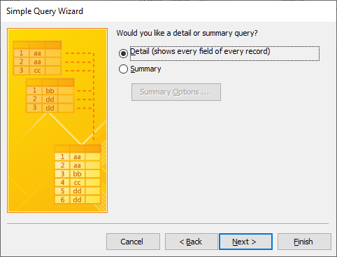 در این پنجره با انتخاب گزینه Detail مشخص میکنیم که تمام فیلدهای تمامی رکوردها باید نمایش داده شوند. برای ایجاد یک پرس و جو براساس گروهبندی و ایجاد فیلدهای محاسباتی از گزینه Summary استفاده میکنیم. این گزینه در قسمت بعدی معرفی خواهد شد.