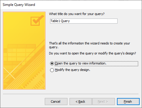 در مرحله بعد یک نام برای پرس و جو مشخص کرده، در قسمت Open the query to view information نتیجه پرس و جو نمایش داده خواهد شد و با انتخاب Modify the query design میتوانیم در ساختار پرس و جو تغییراتی ایجاد کنیم و پرس و جو را براساس نیاز خود ویرایش کنیم.نام گذاری برای پرس و جوی ایجاد شده نیز در ابتدای این پنجره صورت میگیرد. پس از انتخاب گزینه Finish یک پرس و جو ایجاد خواهد شد.