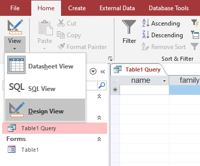 برای اجرای دستور ویرایش یک پرس و جو، از برگه Home در قسمت Views گزینه Design را کلیک میکنیم. پنجرهی طراحی پرس و جو ظاهر میشود.