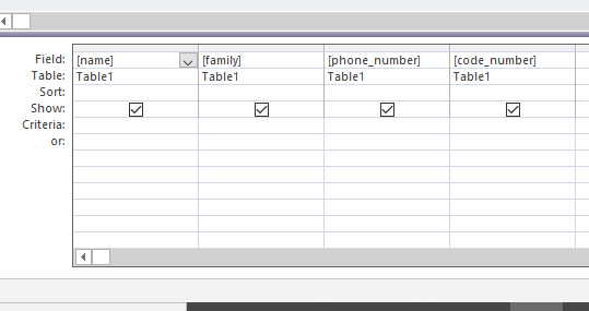 - Show: با این گزینه تعیین میکنیم که این فیلد در پرس و جوی ما نمایش داده شود یا خیر. ممکن است این سوال پیش آید اگر فیلدی در پرس و جو نمایش داده نمیشود چه لزومی دارد که این فیلد به پرس و جو اضافه شود. پاسخ این سوال آن است که ممکن است بخواهیم شرط خاصی را روی فیلدی اعمال کنیم ولی نمیخواهیم خود فیلد نمایش داده شود. برای مثال میخواهیم شرطی روی کد تلفن اعمال کنیم ولی خود فیلد را نمایش ندهیم.