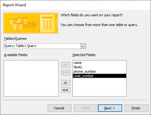 در گام اول باید مشخص کنیم که برای کدام جدول یا پرس و جو میخواهیم گزارش ایجاد کنیم. سپس فیلدهای را که میخواهیم در گزارش نمایش داده شود را انتخاب میکنیم. محتویات این پنجره درست به مانند راهنمای ایجاد فرم و برس و جو است.