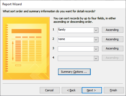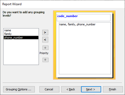 در مرحله بعد مشخص میکنیم که گزارش براساس کدام فیلد یا فیلدها گروه بندی شود. این کار میتواند گزارشی برای نشان دادن شماره تلفنها برحسب گروههایی از کد شهر ایجاد کند. به این ترتیب گزارش، رکوردهایی که در این فیلد مقدار مشترکی دارند، در یک گروه نمایش داده میشوند.