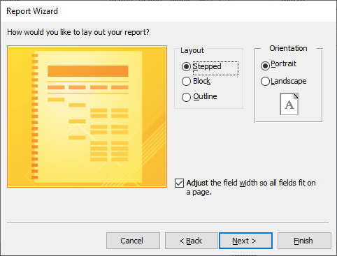 در مرحله بعدی قالببندی یا چیدمان (Layout) گزارش را تعیین میکنیم. همچنین میتوانیم از بخش Orientation نحوه چاپ اطلاعات روی کاغذ را نیز تعیین کنیم.