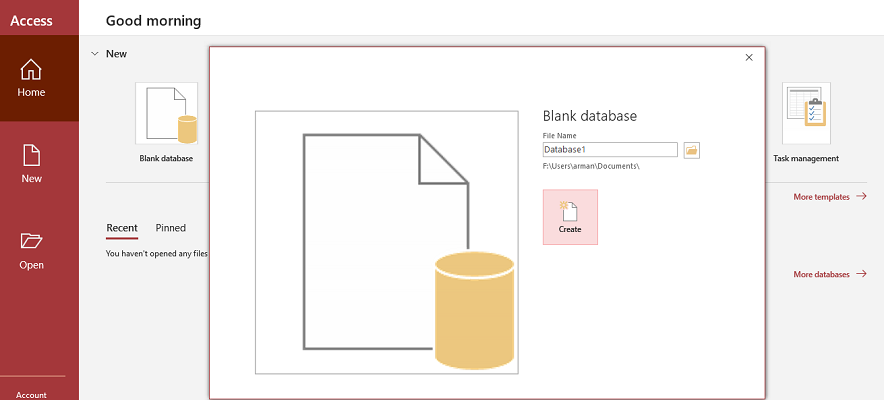 پس از اجرای اکسس محیط اولیه نرمافزار ظاهر میشود. با توجه به اینکه از نسخه ۲۰۱۶ اکسس در این مطلب استفاده کردهایم، شکل ظاهری هنگام باز کردن این نرمافزار به صورت زیر خواهد بود. در گام اول لازم است که یک پرونده بانک اطلاعاتی ایجاد کنیم. در پنجرهای که در شکل زیر میبینید با انتخاب گزینه Blank Database این کار صورت گرفته و کافی است نام و محل آن فایل را در گام بعدی مشخص کنید.