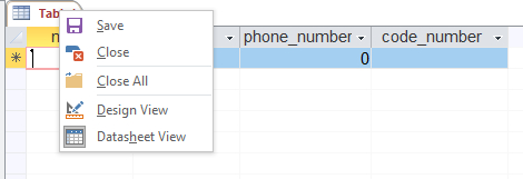 نکته: در پایان کار طراحی جدول، حتما آن را ذخیره کرده باشید. در غیر اینصورت پیغامی برای ذخیره سازی آن ظاهر خواهد شد. کافی است روی برگه مربوط به جدول، کلیک راست کرده و از فهرست ظاهر شده دستور Save یا Close را انتخاب کنید.