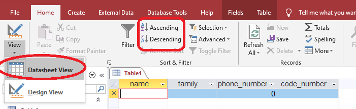 برای دسترسی سریعتر یا دستهبندی اطلاعات جدول بهتر است جدول مرتب شود. اطلاعات جدول را میتوان براساس یک فیلد مرتبساز کرد. برای این کار جدول را در نمای Datasheet ظاهر کرده، فیلدی که مبنای مرتب سازی است را انتخاب میکنیم. برای این کار کافی است در یکی از سلولهای فیلد مربوطه کلیک کنید. سپس از فهرست Record دستور Sort را انتخاب میکنیم. مرتب سازی را میتوان به دو صورت صعودی (Ascending) و یا نزولی (Descending) انجام داد.
