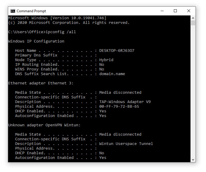 اگر لازم باشد مک آدرس یک قطعه را پیدا کنید، در محیط ویندوز کافی است پنجره CMD را باز کنید و زمانی که اعلان فرمان را مشاهده کردید، دستور ipconfig /all را وارد کرده و اینتر را بزنید. به این ترتیب مجموعهای از برچسبها و مقادیر نمایش مییابند. مک آدرس زیر عنوان Physical Address قابل مشاهده است.