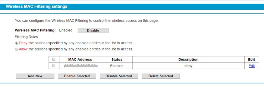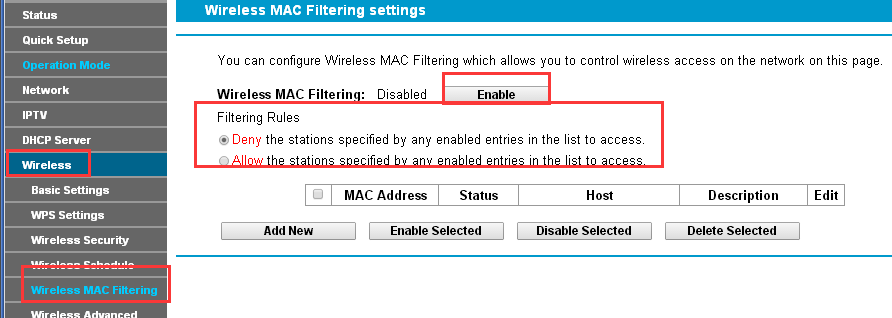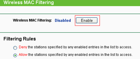 در نهایت در بخش Filtering Rules یکی از گزینههای Allow/Deny را وارد کرده و کارکرد Wireless MAC Filtering را به صورت Enable تنظیم کنید.