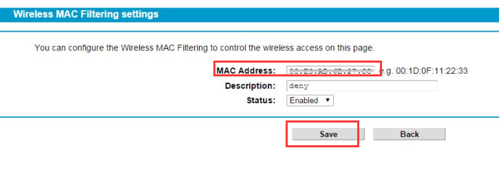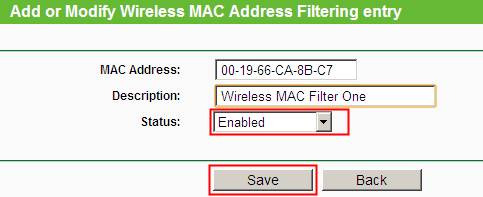 مک آدرسی که میخواهید اجازه دسترسی به روتر را داشته یا نداشته باشد وارد کرده و یک توضیح برای این آیتم نیز وارد نمایید. وضعیت این گزینه باید به صورت Enabled باشد و در نهایت روی دکمه Save کلیک کنید.