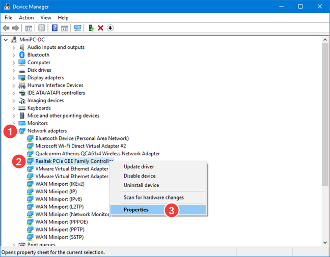 اپلیکیشن Device Manager را باز کرده و در پنجره مربوطه روی فلش کنار Network adapters بزنید تا لیستش نمایش یابد. روی کارت آداپتری که میخواهید تغییر دهید راست-کلیک کنید. گزینه Properties را انتخاب کنید.