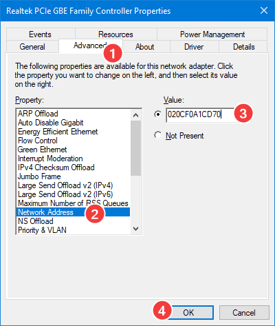 در پنجره Properties زبانه Advanced را انتخاب کنید. Network Address را از لیست نمایش یافته زیر عنوان Property انتخاب کرده و مک آدرس جدید را در سمت راست وارد نمایید. زمانی که این کار را انجام دادید روی OK کلیک کنید.