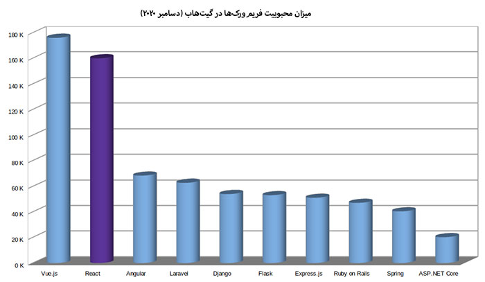 میزان محبوبیت فریمورکهای تحتوب براساس رتبهبندی گیتهاب